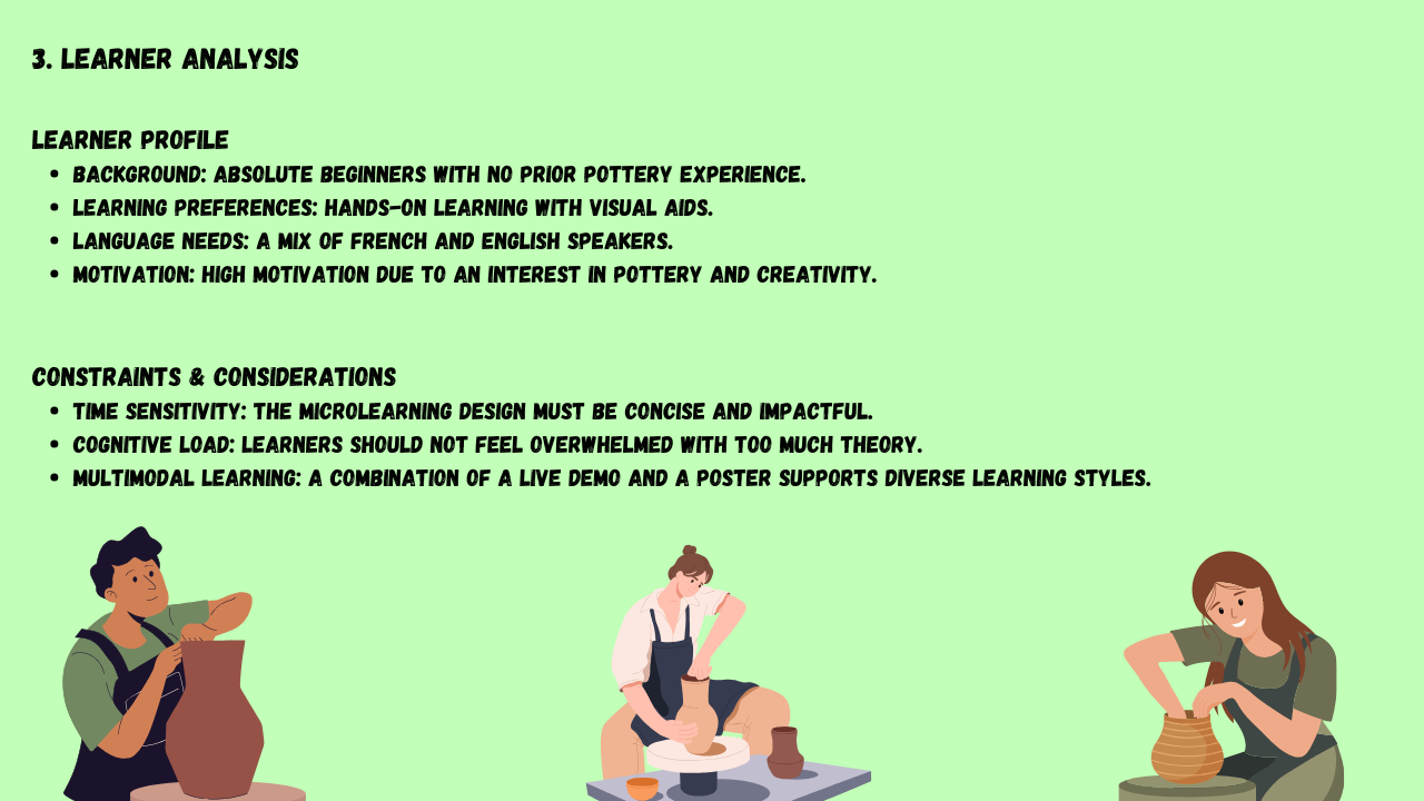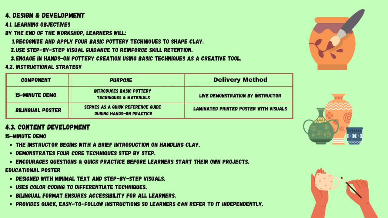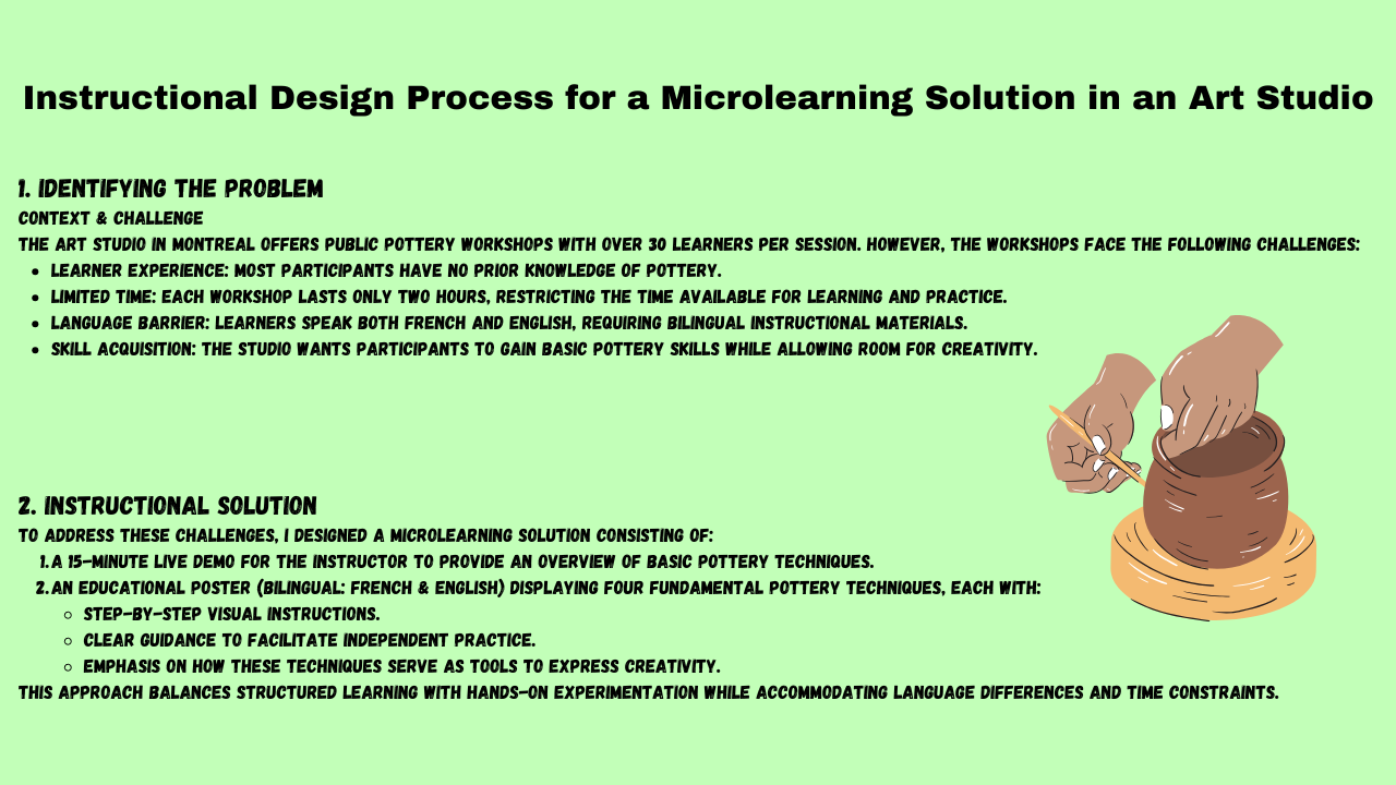 For this project, I designed a microlearning solution tailored to a public pottery workshop with over 30 beginners, accommodating bilingual learners (French & English) within a two-hour timeframe. To ensure an effective and engaging learning experience, I integrated instructional design, graphic design, subject matter expertise, and microlearning principles into a cohesive learning strategy. At the core of the design was a 15-minute live demonstration, carefully structured to introduce learners to four fundamental pottery techniques. To reinforce learning and support independent practice, I developed a bilingual instructional poster, leveraging graphic design principles to provide step-by-step visual guidance with minimal text. This multimodal approach ensured that learners could easily reference techniques, regardless of language proficiency. To ensure accuracy and instructional clarity, I conducted a subject matter expert (SME) interview with the workshop instructor, aligning the content with practical, hands-on learning needs. By structuring the learning journey with microlearning principles, I reduced cognitive overload, allowing participants to quickly grasp essential skills and immediately apply them to their creative process. This interconnected approach—blending live instruction, visual learning aids, and bilingual accessibility—enabled a structured yet flexible learning experience. Participants not only developed foundational pottery skills but also felt empowered to express creativity through guided experimentation.